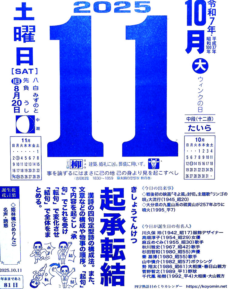 原えつお四文字ひめくりカレンダー令和7年10月11日(土)先負 二十八宿:柳「起承転結」旧歴8月20日