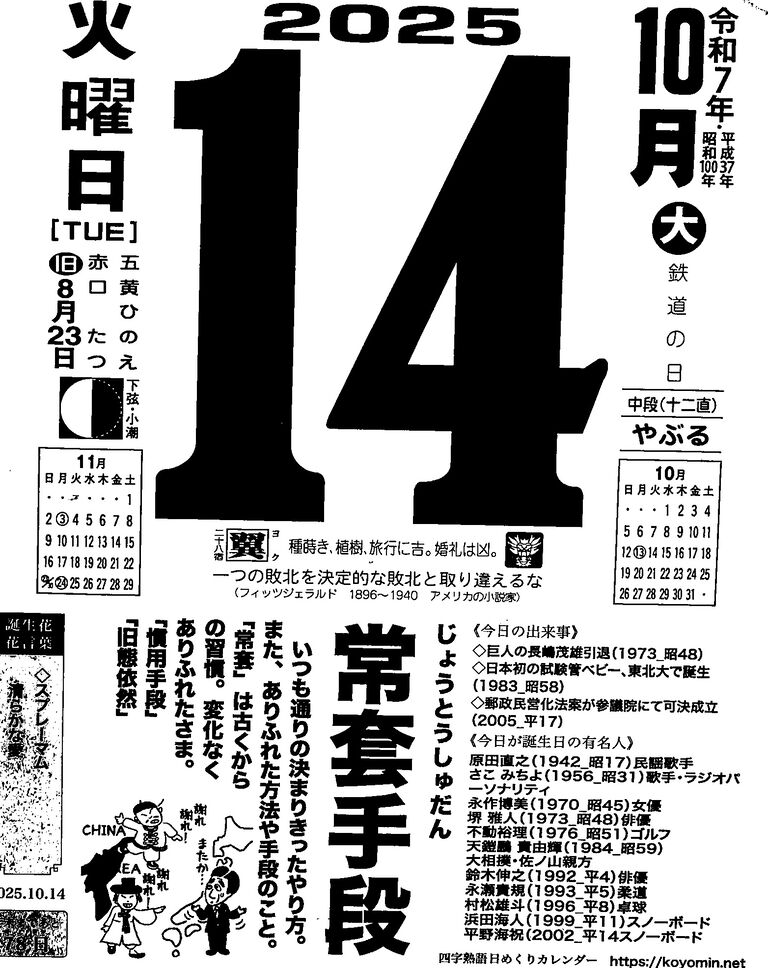 原えつお四文字ひめくりカレンダー令和7年10月14日(火)赤口 鉄道の日「常套手段」旧歴8月23日