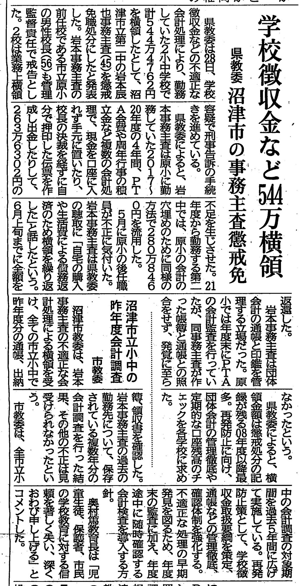 沼津市教委は、岩本事務主査の不適正な会計処理による横領を受け、全ての市立小中で昨年度分の通帳、出納簿、領収書を確認した。岩本事務主査の過去の勤務先について、保存されている複数年分の会計調査を行った結果、その他の不正は見受けられなかったという。