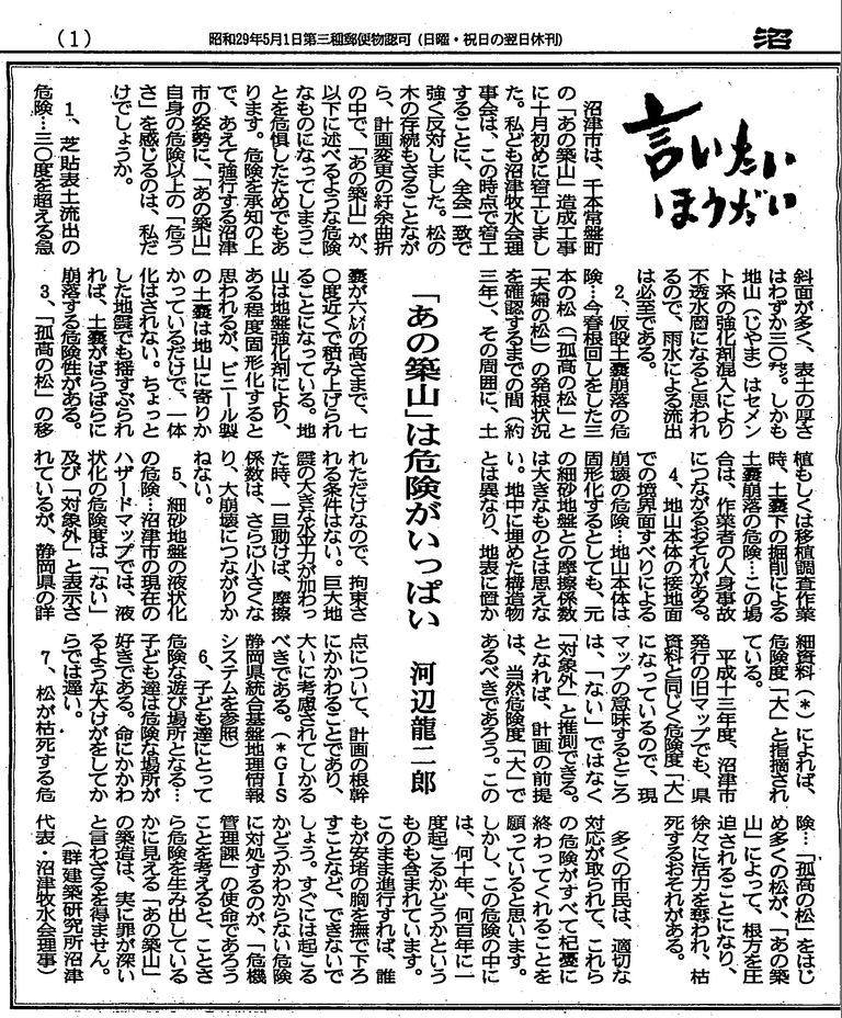 多くの市民は、適切な対応が取られて、これらの危険がすべて杞憂に終わってくれることを願っていると思います。しかし、この危険の中には、何十年、何百年に一度起こるかどうかというものも含まれています。このまま進行すれば、誰もが安堵の胸を撫で下ろすことなど、できないでしょう。すぐには起こるかどうかわからない危険に対処するのが、「危機管理課」の使命であろうことを考えると、ことさら危険を生み出しているかに見える「あの築山」、の築造は、実に罪が深いと言わざるを得ません。